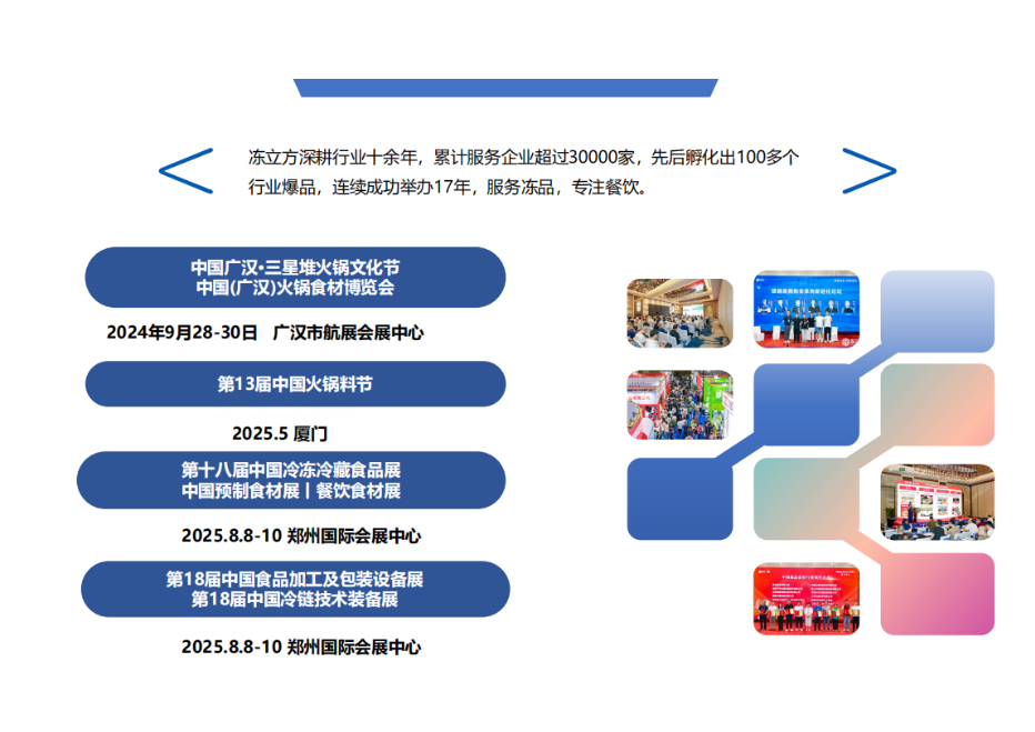 第十七届中国冷冻冷藏食品展|第三届中国预制菜展览会|第十七届中国餐饮食材展,将于2025年8月8日-10日在郑州国际会展中心乘势而起,焕新升级。8万+平方米展会规模、十二馆齐开、8大主题展区、 聚焦冷冻餐饮食材全产业链、上万款行业新品首发、数千款爆品呈现、头部品牌齐聚,覆盖行业上中下游产业,10万+数据库多渠道宣传,深化供需对接,360°全网营销,引爆行业关注。