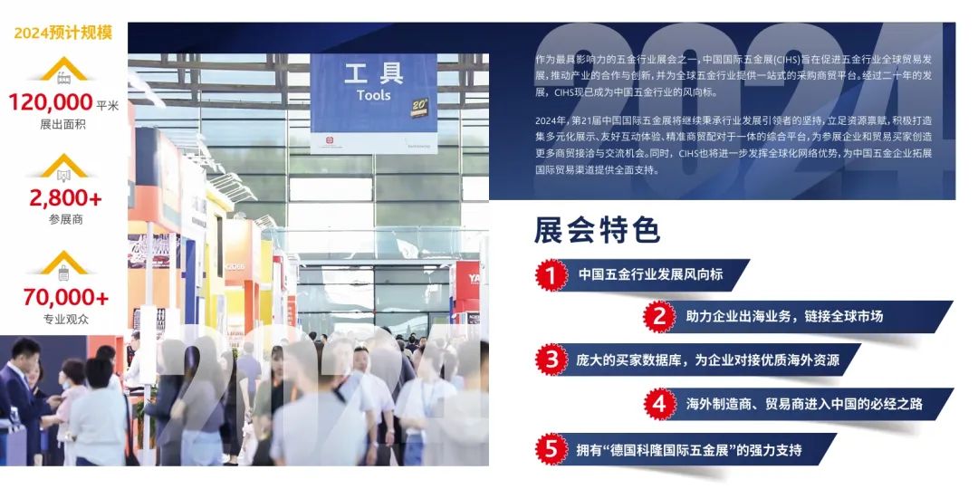 为应对当前国内外经济发展形势,顺应时代趋势,本届展会采取一系列新措施、新手段,为行业企业寻求发展突破口,打通产业链、供应链堵点,打造全球市场“共赢链”,致力于将CIHS打造成前瞻行业新趋势和前沿发展理念的专业商贸拓展、信息交流平台为培育五金新质生产力,持续推动行业高质量发展贡献力量。
