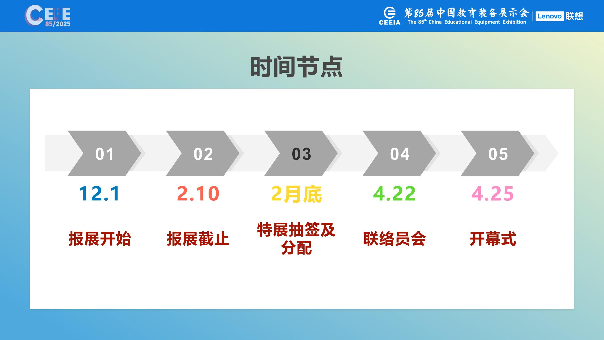 第85届中国教育装备展示会已于2024年12月1日开放了报展系统,并将于2025年2月10日关闭报展系统,请有意向参展的企业积极联系报名,报名截止后,组委会将于2月底组织特展抽签及展位分配等工作。