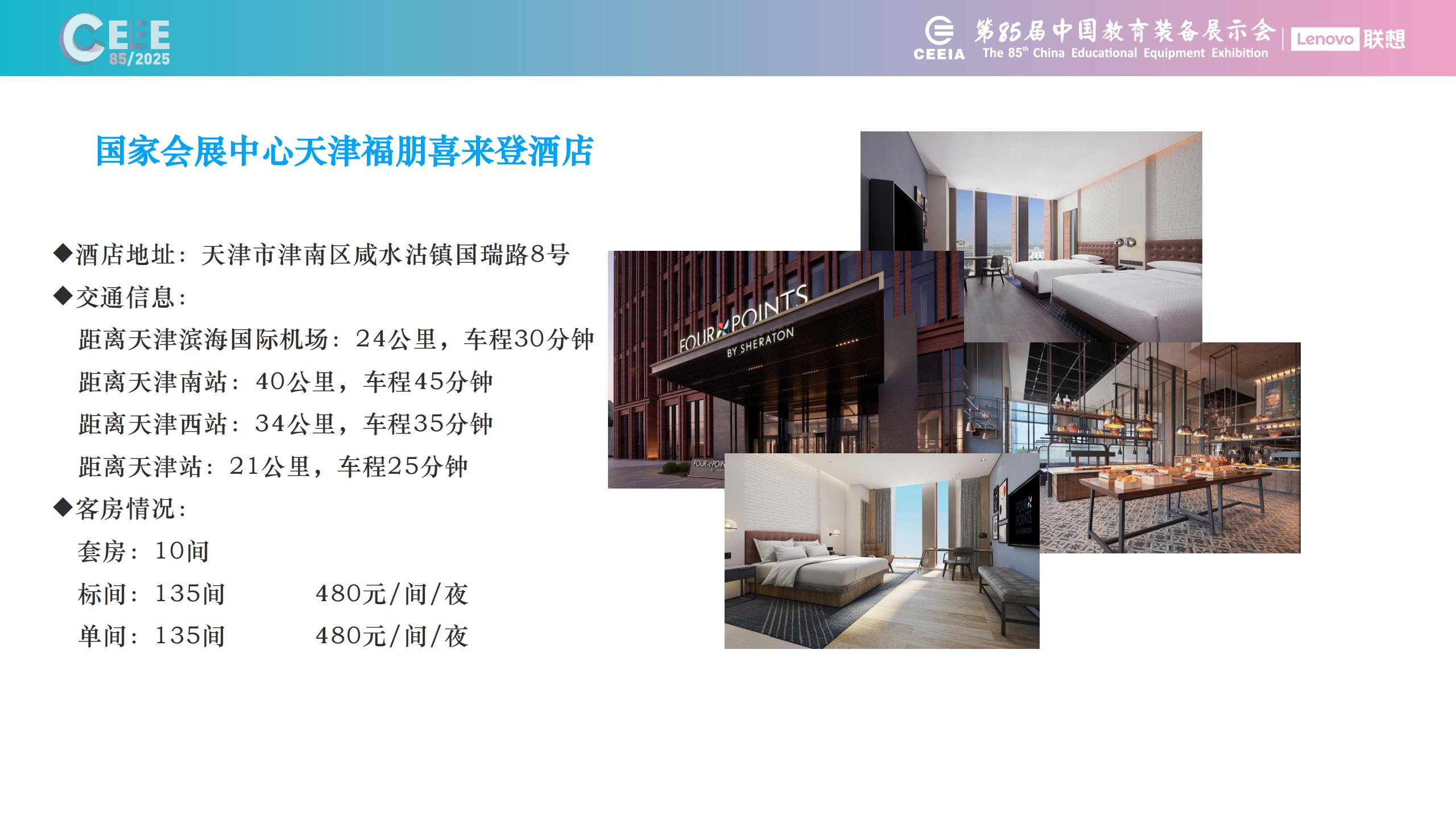 第85届中国教育装备展示会的主会场为国家会展中心天津福朋喜来登酒店和国家会展中心天津万豪酒店。酒店毗邻国家会展中心,两家酒店在展示会期间总计提供430间客房,其中标间235间,单间185间,套房20间。