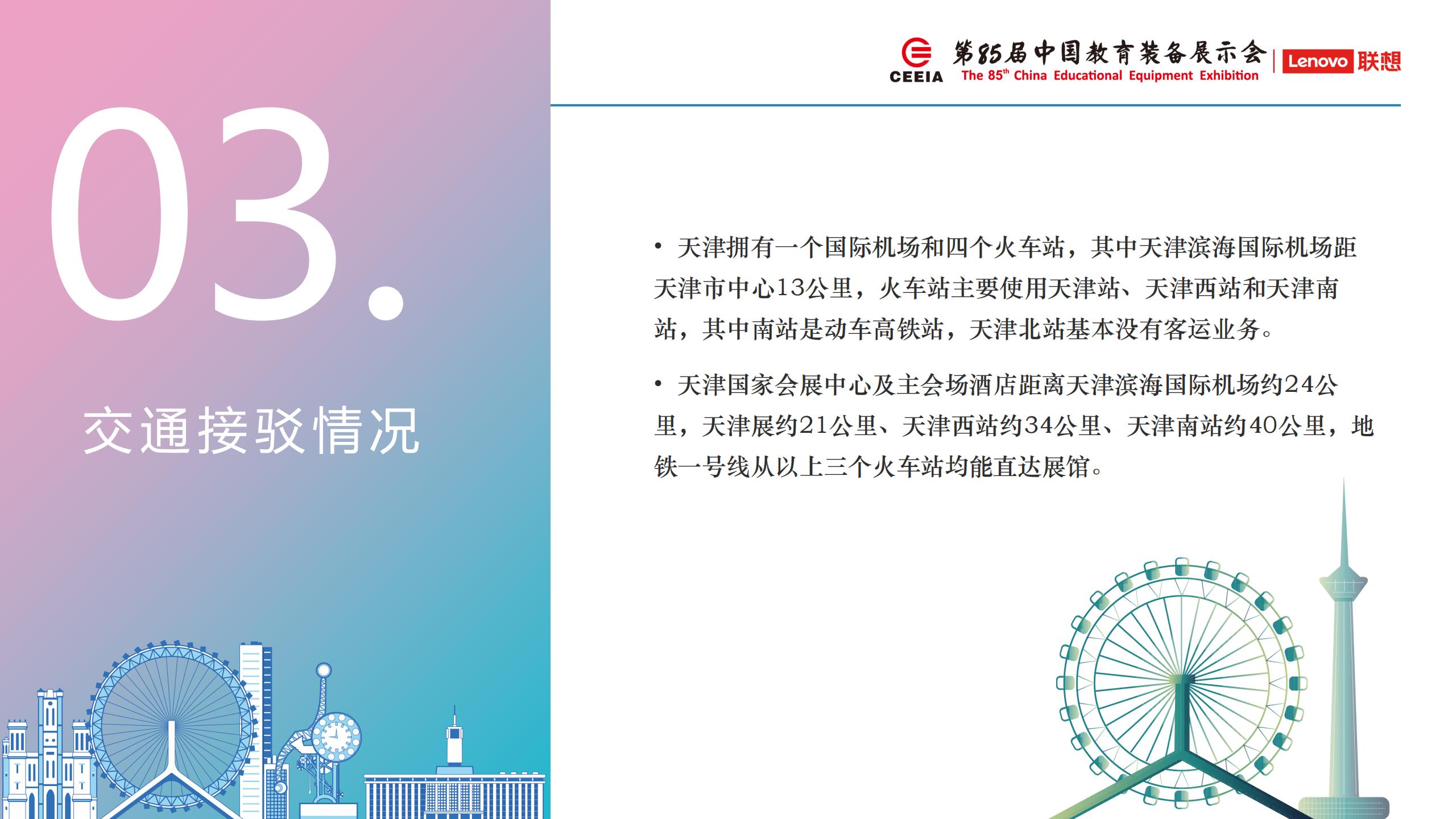 第85届中国教育装备展示会再次回到天津,对于会务接待工作的压力非常巨大。我们将全力以赴做好主会场酒店的接待服务工作,细化接待服务工作,完善服务内容,另外针对参展商的酒店预定工作我们安排如下调整:1、提供两家会务服务商的酒店预定清单(青岛左格会展/北京中悦国际);2、提供每日接驳班车往返各驻会酒店和展馆;3、保证各省团行政领导、各省协会主要人员住宿主会场酒店。