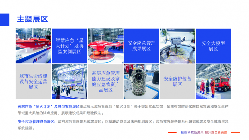 政府应急管理体系成果展区;区域联动成果及未来规划展区;应灾装备体系化研究成果及安全城市应急系统建设。