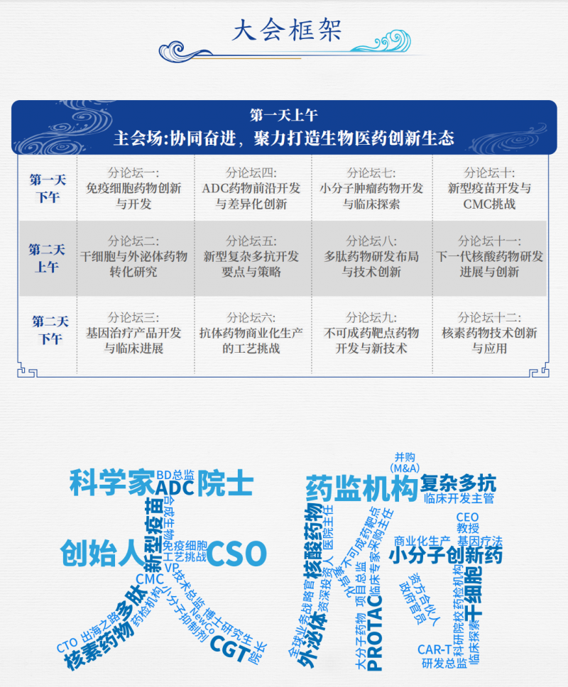 拟邀以及在邀中:原国家食品药品监督管理局局长邵明立、中国科学院院士魏于全、百济神州生物岛创新中心首席执行官刘建等行业权威专家、企业领袖将出席大会。他们将围绕产业政策、技术创新、临床转化等议题分享洞察,为产业升级提供思路指引。在为期两天的会议中,超过 80 位演讲专家将带来深度解读与经验分享。