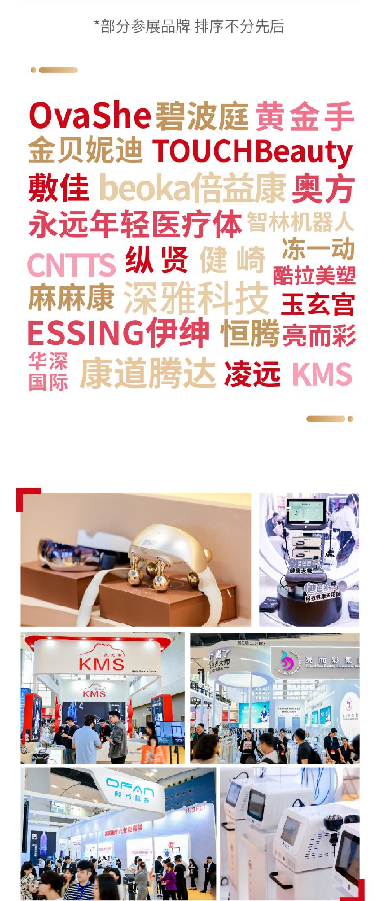 特色展区:特设医美及配套产品展区、美甲美睫及护理展区、绿色供应链专区、渠道好物爆品区、贵妇护肤体验专区、口服美容爆品区、科技美容专区、医学美容专区、养生健康专区、展团专区等。