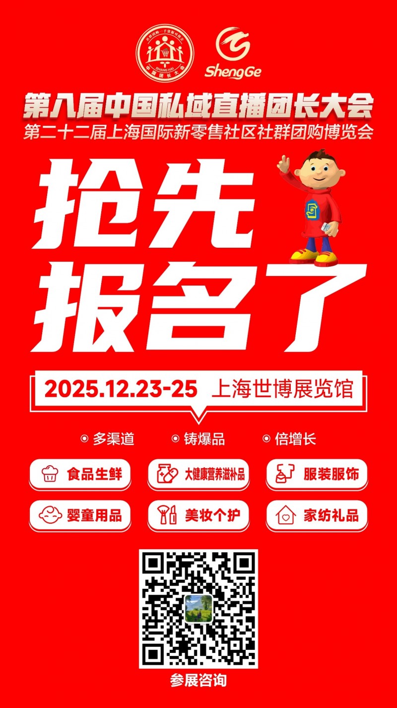 第八届中国私域直播团长大会暨第二十二届上海国际新零售社区社群团购博览会将于2025年12月23-25日在上海世博展览馆继续举办。
