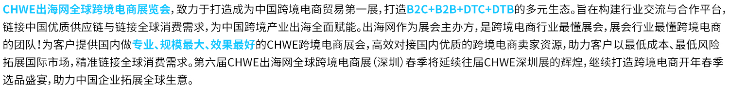 2026年第七届CHWE出海网全球跨境电商展(深圳)秋季展全新升级,将于2026年9月3-6日举行。展会布展以及开展时间较以往整体提前1天,展期由3天增加至4天,2026年秋季展以及后续CHWE深圳展期全部增加至4天。这不仅是行业跨境电商主题专业展4天连展,更充裕的时间也为展商增加更多的品牌曝光以及创造更多交易机会。