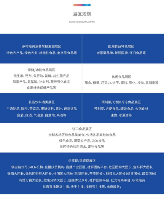 聚焦食品电商选品趋向规则,现场设置乡村振兴特色展区、休闲食品展区、乳品饮料酒类展区、预制菜/方便&冷冻食品展区、保健/功能食品展区、进口食品展区、供应链/渠道商展区,热门SKU和极致单品一网打尽!