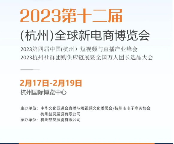 2023第十二届(杭州)全球新电商博览会于2023年2月17-19日杭州国际博览中心盛大召开,本次大会预计展出7大展馆、10万平方、2600家优质展商,拟邀请20万专业观众到场参观选品、贸易合作,推动新电商行业创新发展,深度赋能产业数字化转型,助力参展企业构建线上新渠道产业链布局,推动“直播+短视频”、“社群+团购”、数字+电商”等新模式发展,促进我国新电商产业规范、健康发展,为稳经济、扩内需、促消费提供有力支撑,为我国经济提质升级与数字化发展以及助力乡村振兴提供新动能、新模式。