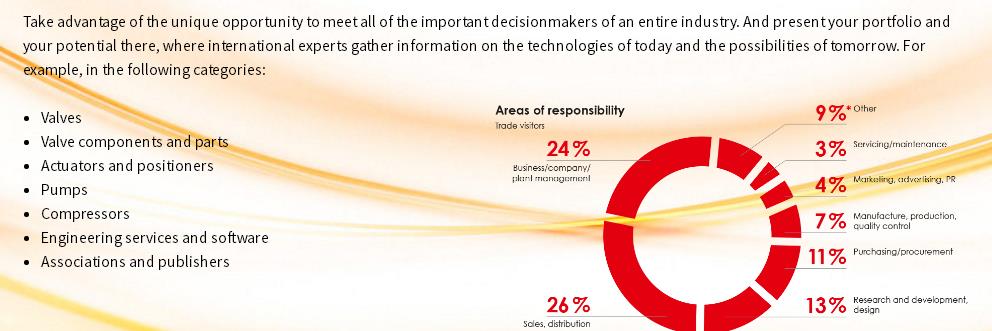 2024年德国杜塞尔多夫阀门世界展/2024年德国杜塞尔多夫泵阀展览会(Valve World)王圣楠weixin:SunnyWang1110展会时间:2024年12月03-05日展会地点:德国杜塞尔多夫会展中心主办单位:KCI WORLD、杜塞尔多夫展览公司举办周期:两年一届中国组展:北京融合国际展览有限公司展会介绍:德国阀门世界博览会是世界范围内唯一专业性的阀门展,由业内深具影响的专业荷兰“阀门世界”及其母公司KCI 自1998 年开始举办,每两年一届,地点设在荷兰马斯特里赫展览中心。从2010 年11 月起,阀门世界博览会迁至德国杜塞尔多夫。在2010 年,阀门世界博览会第一次在新的地点杜塞尔多夫举行。贸易参观者从都使用阀门技术的造船部门,汽车和汽车工程,化工,电力供应业,海洋和近海工业,食品加工业,机器和工厂建设等,他们都将齐聚在这次阀门世界博览会上。阀门世界博览会近几年的不断发展不仅增加了参展商及参观者的数量,同时还刺激了不断扩大展位面积的需求。 产品范围:1、阀门,铝阀,角座阀,防回流阀,球阀,波纹管式阀,蝶阀,陶瓷阀门,止回阀,控制阀,隔膜阀,ESD阀门,闸阀,截止阀,夹套阀,刀栅阀,衬里阀门,液化天然气阀门,杂项阀门,止回蝶阀,其他阀门,夹管阀,塑料阀门,旋塞阀,压力减压阀,压力阀,安全阀,取样阀/取样阀,关断阀,滑动闸阀,电磁阀,不锈钢阀门,液压阀,歧管阀,针阀,气动阀门。2、执行器及控制系统,驱动器配件,传动器,执行器,控制及仪器,控制系统,电动执行机构,液压执行元件,手动执行器,调节型执行器,其他执行器,气动执行器,定位器,阀门执行器,链轮。3、阀门相关产品,铸件,联轴器,紧固件,锻件,垫片,其它相关产品,填料,安全关闭装置,普林斯,阀门联锁,消防夹克。4、密封剂和密封材料,密封系,阀门相关管道产品,爆破片,法兰,流量测量装置,仪表,其他管道,视眼镜,蒸汽疏水阀,过滤,管接头,工程, CAD 系统,测试,无损检测,阀门检测,阀门维修和测试技术,自动化及服务件,社团和出版社。5、管类: 金属管、非金属管、PVC水管、特殊管、水处理用管、管件接头及连接件等各种零件及配件等6、泵类: 离心清水泵、耐腐蚀泵、井泵、混流泵(斜流泵)、轴流泵、旋涡泵、管道泵、自吸泵、液下泵、杂质泵( 污水泵、污物泵、无堵塞泵、 渣浆泵、 泥浆泵、砂泵、杂质泵)真空泵、往复泵、计量泵、试压泵等7、阀类: 污水处理用阀门、家用供水和下水阀门、建筑供水阀门、公共设施用阀门、海上用阀门、工程用阀门等8、水处理和污水处理系统: 供水、排水系统、水和污水处理、饮用水设备、水生产及管理服务、在线控制系统及仪器仪表、水质检测及分析仪器、过滤设备、环保设备等9、流体机械: 密封件、防腐材料、管网检测设施、管道安装设备、管道清洗设备、管道防漏设备及技术、压缩机、安全防护设备等