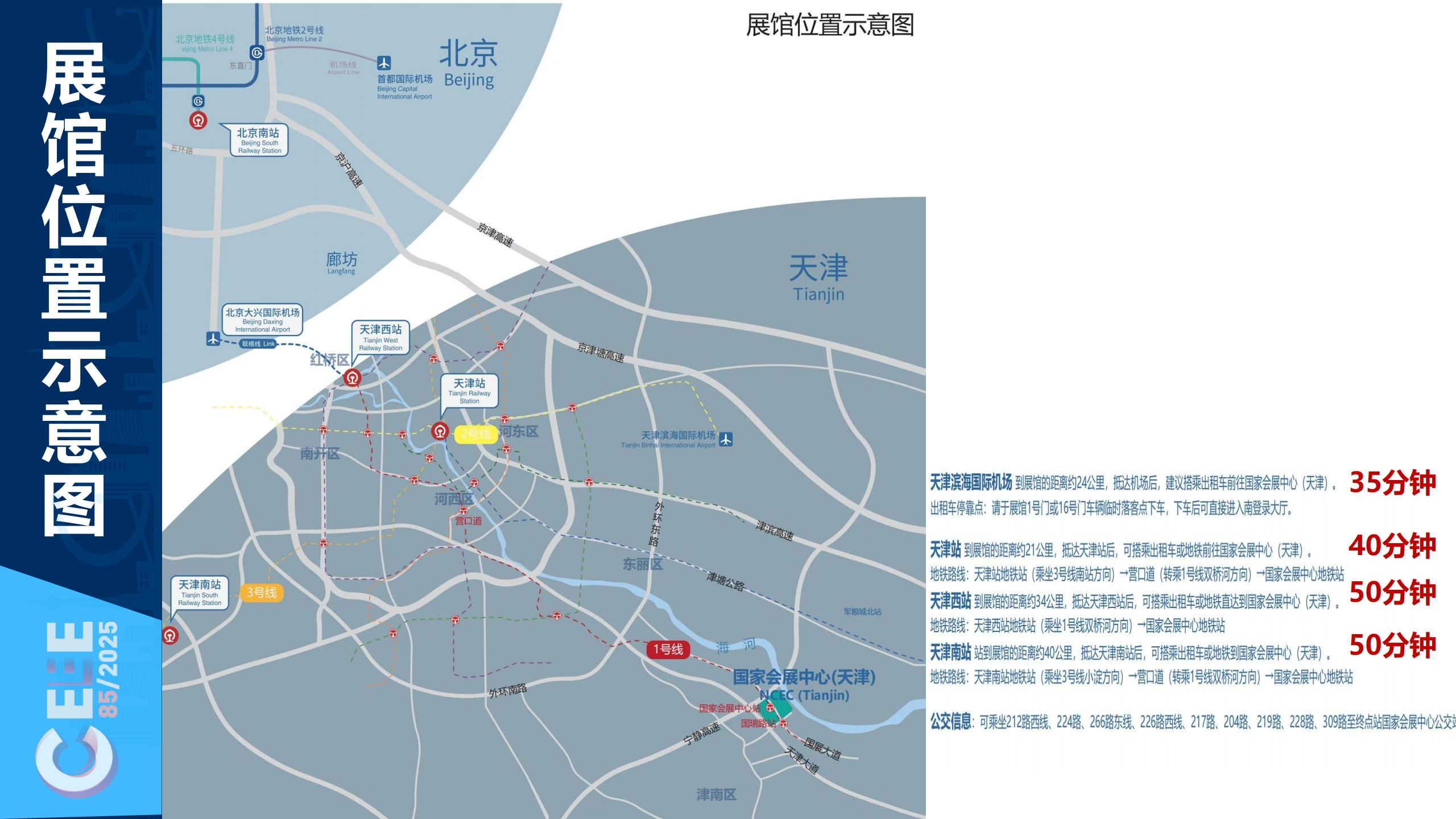 天津拥有一个国际机场和四个火车站,其中天津滨海国际机场距天津市中心13公里,火车站主要使用天津站、天津西站和天津南站,其中南站是动车高铁站,天津北站基本没有客运业务。天津国家会展中心及主会场酒店距离天津滨海国际机场约24公里,天津站约21公里、天津西站约34公里、天津南站约40公里,地铁一号线从以上三个火车站均能直达展馆。