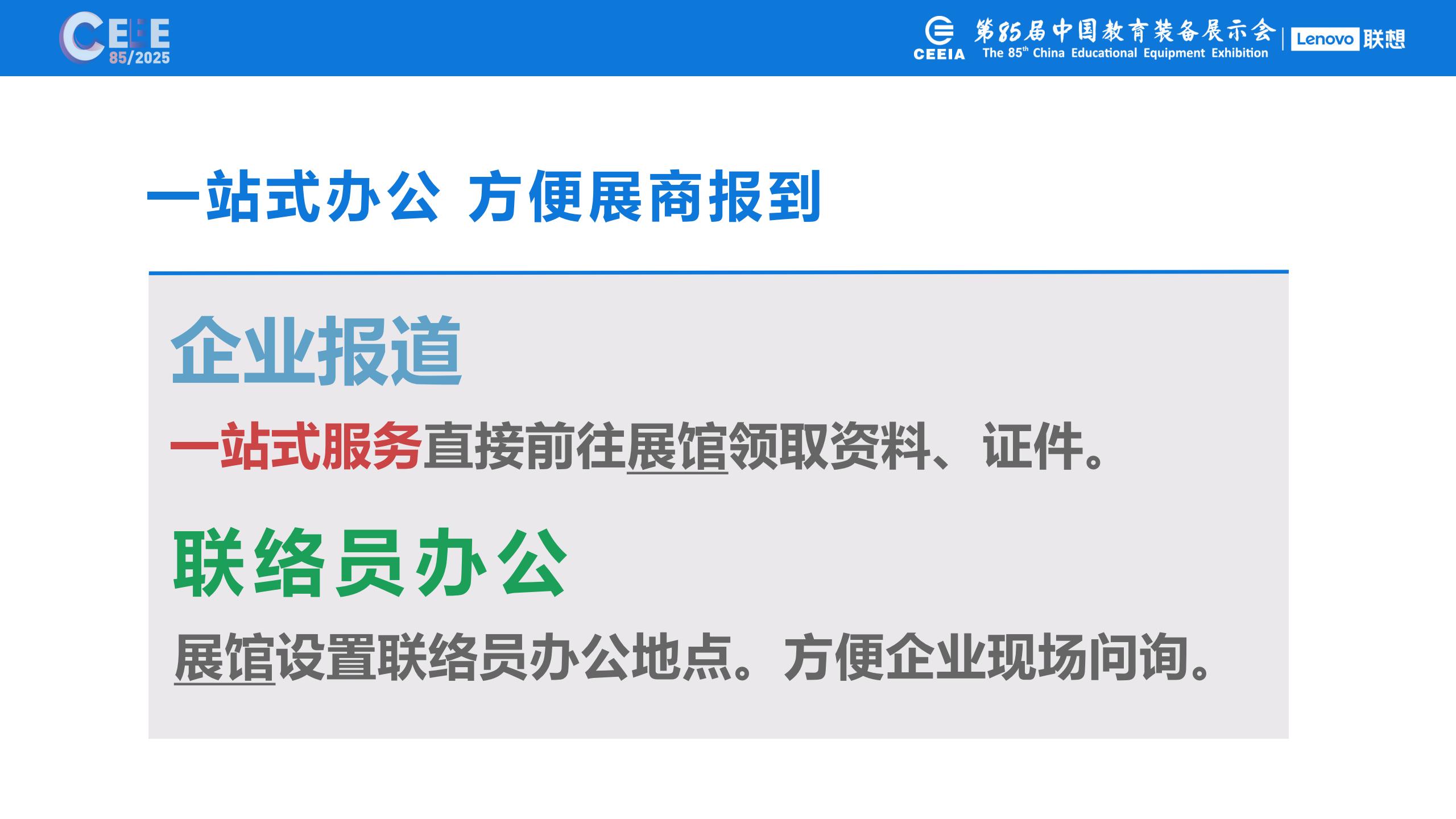 第85届中国教育装备展示会已于2024年12月1日开放了报展系统,并将于2025年2月10日关闭报展系统,请有意向参展的企业积极联系报名,报名截止后,组委会将于2月底组织特展抽签及展位分配等工作。
