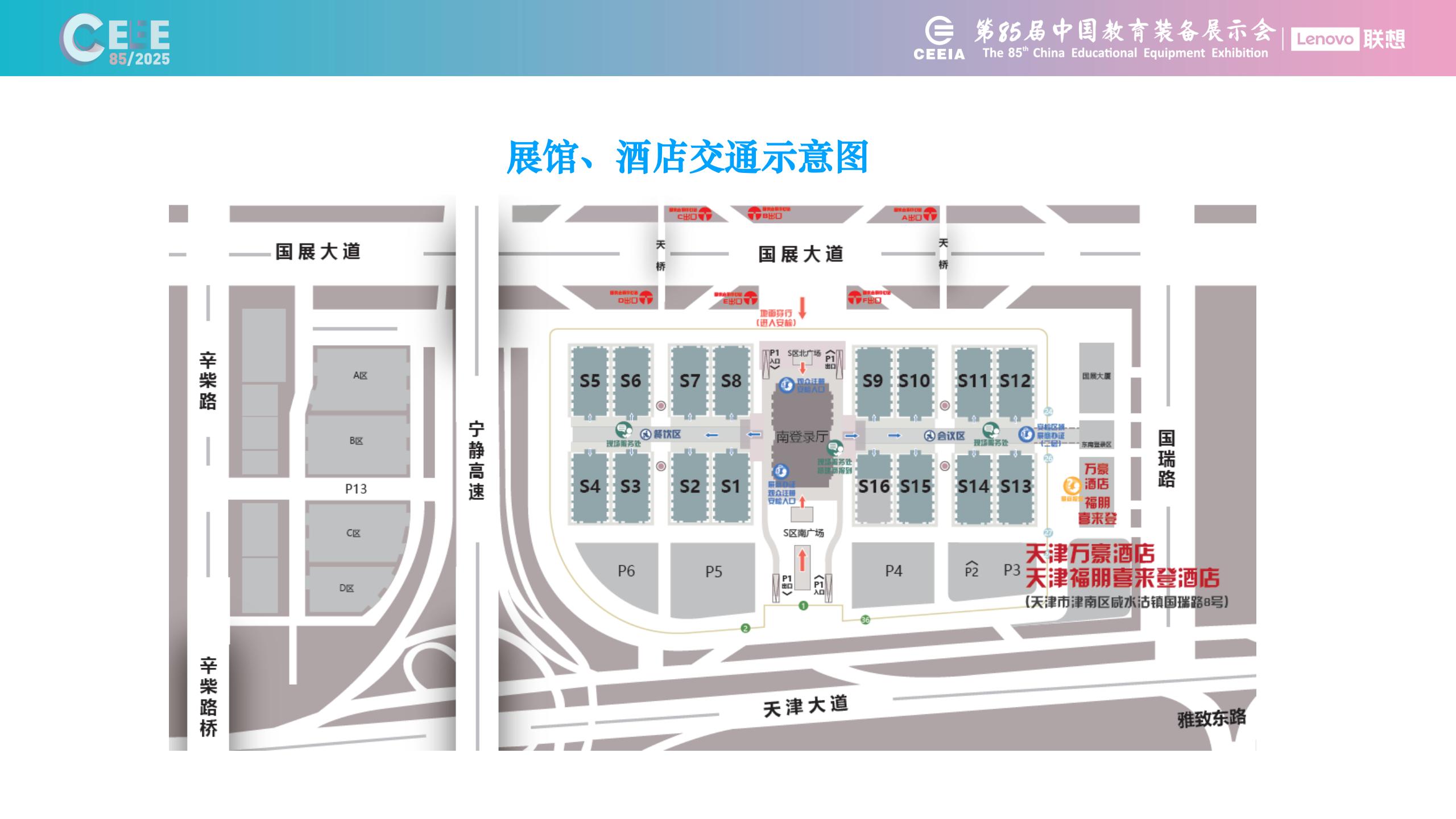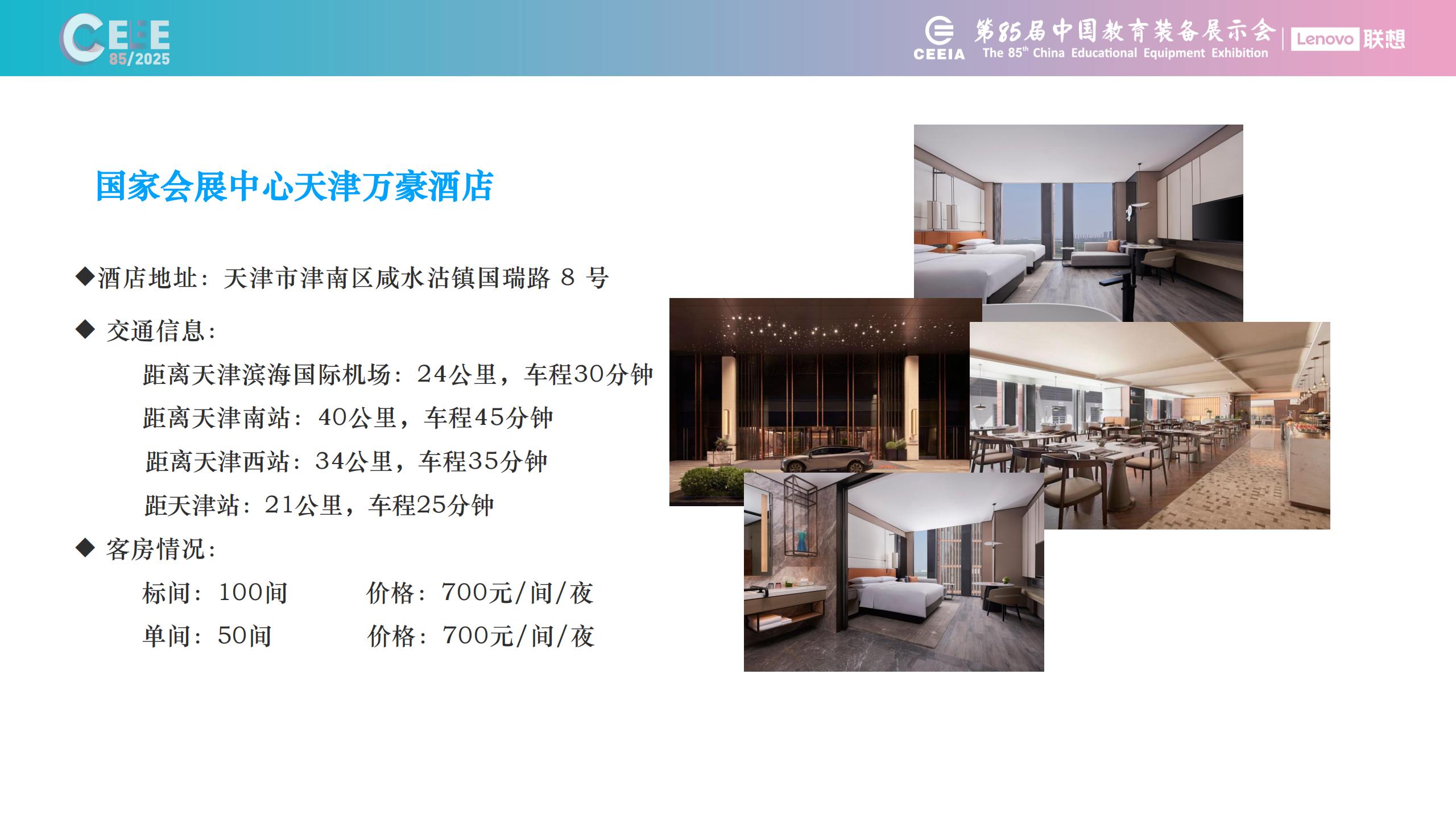 第85届中国教育装备展示会的主会场为国家会展中心天津福朋喜来登酒店和国家会展中心天津万豪酒店。酒店毗邻国家会展中心,两家酒店在展示会期间总计提供430间客房,其中标间235间,单间185间,套房20间。