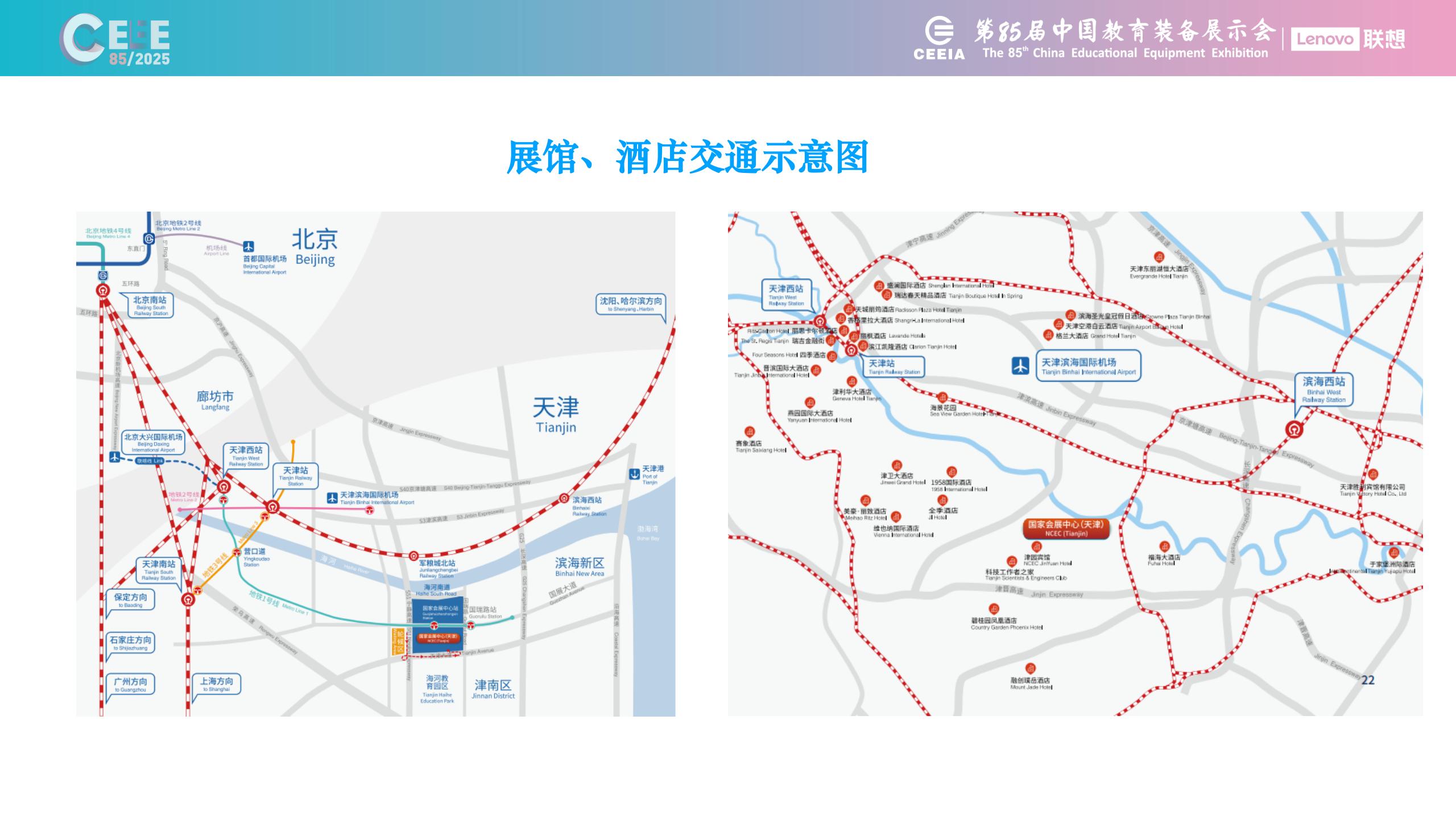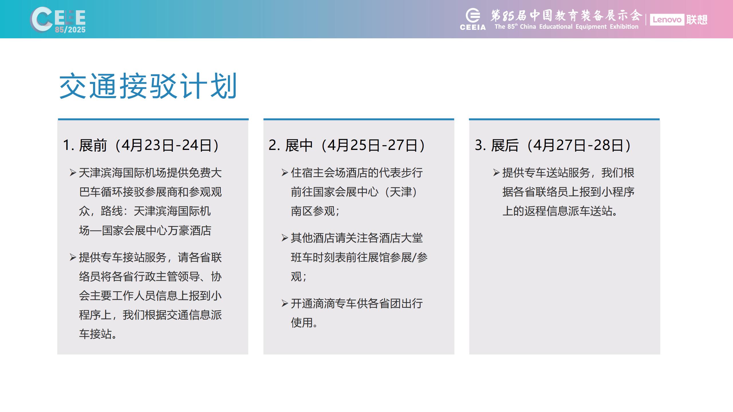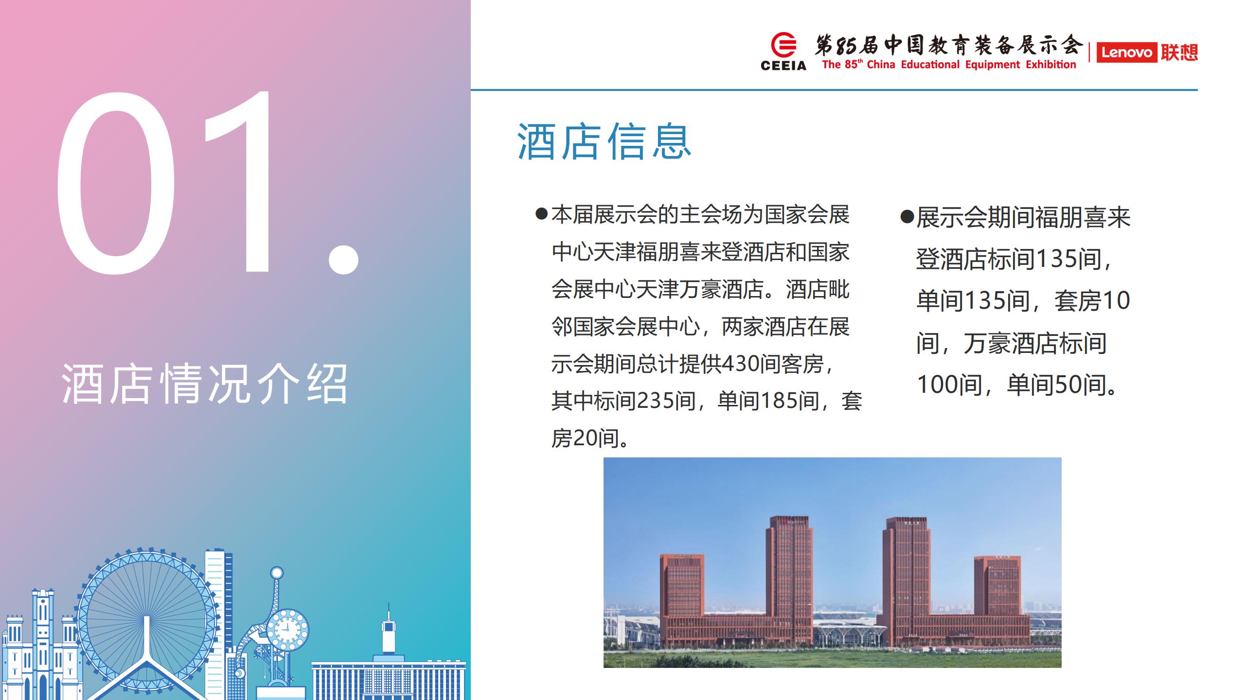 第85届中国教育装备展示会再次回到天津,对于会务接待工作的压力非常巨大。我们将全力以赴做好主会场酒店的接待服务工作,细化接待服务工作,完善服务内容,另外针对参展商的酒店预定工作我们安排如下调整:1、提供两家会务服务商的酒店预定清单(青岛左格会展/北京中悦国际);2、提供每日接驳班车往返各驻会酒店和展馆;3、保证各省团行政领导、各省协会主要人员住宿主会场酒店。