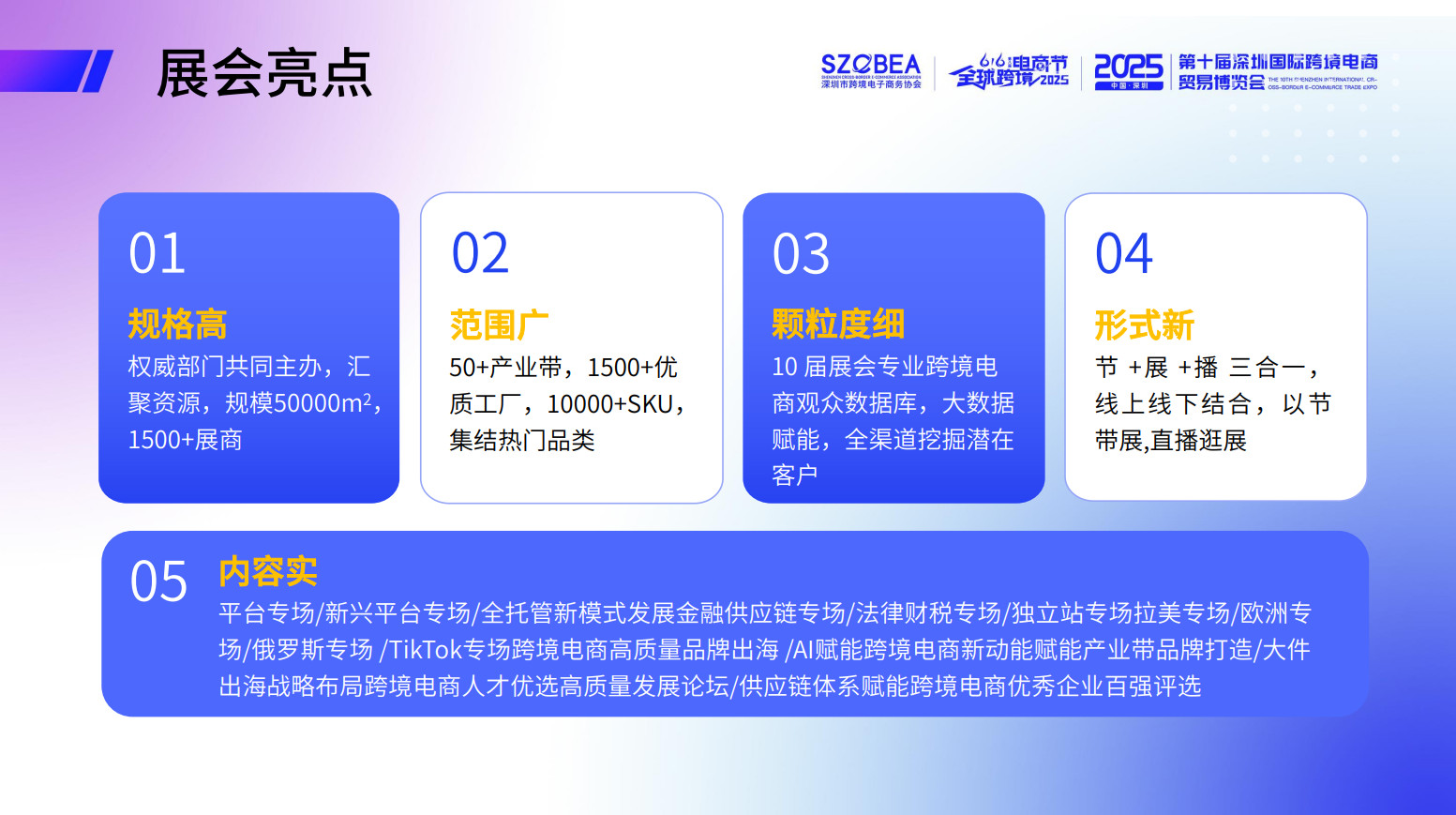 随着全球经济的不断发展和电子商务的迅速崛起,跨境电商作为一种新兴的商业模式,正在逐渐改变传统贸易的格局。2025年第十届深圳国际跨境电商贸易博览会即将拉开帷幕,这一盛会为行业内的企业和个人提供了一个的机遇,展示和交流新的跨境电商产品与服务。