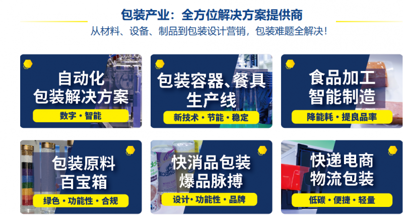 展品范围: 食品饮料加工及包装机械、医药化妆品加工及包装机械、非食品消费品及工业品加工及包装机械、糕点糖果及烘焙食品加工及包装机械、塑料及纸包装容器生产设备(瓶、杯、袋、盒等)、包装材料生产及加工机械、包装材料、包装容器及包装制成品、包装原材料、包装印刷、加工与包装配件、智能/自动化包装、物流包装、包装设计、服务