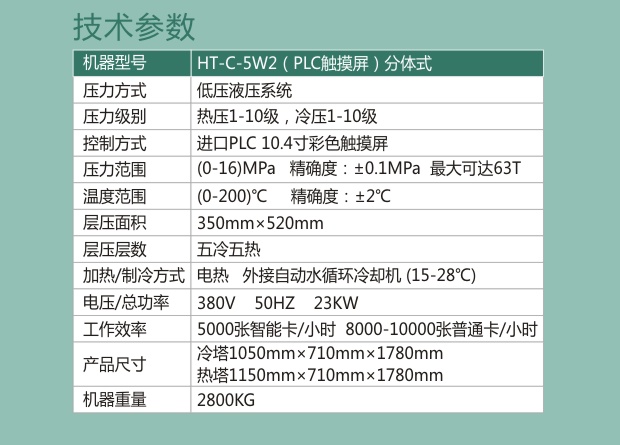 HT-C-5W2 (PLC触摸屏) 专业型层压机是针对专业厂家生产RFID,IC,ID芯片层压而开发的高性能设备。有效控制生产过程中废品率、难以操作等难题。也是为配套制作二代身份证等高档证件卡、银行卡、公交一卡通、高速公路、社保卡等专业制作卡片的公司、卡厂开发的专业PVC智能卡层压机。